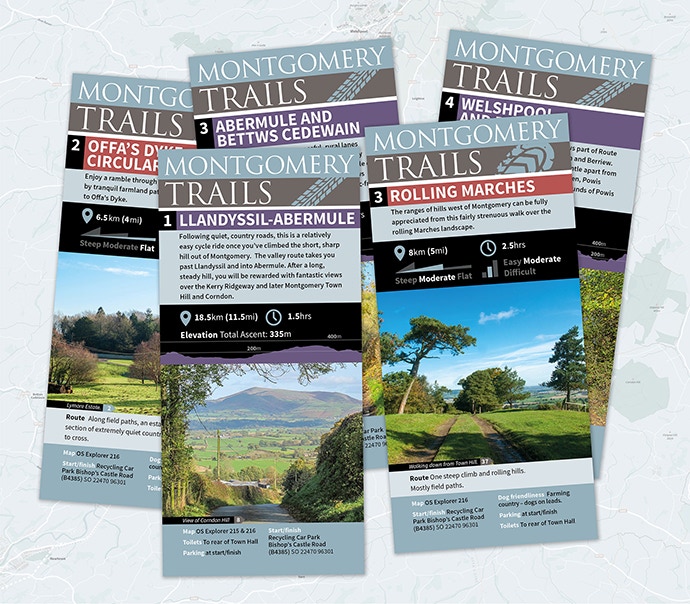 Montgomery Trails is a set of walking and cycling trails in and around Montgomery. They are all circular trails and take in some of the stunning countryside views and features off the area. They are available as printed leaflets in the hotel, from the Institute / Tourist Information Centre in Arthur Street, or as downloadable versions online.